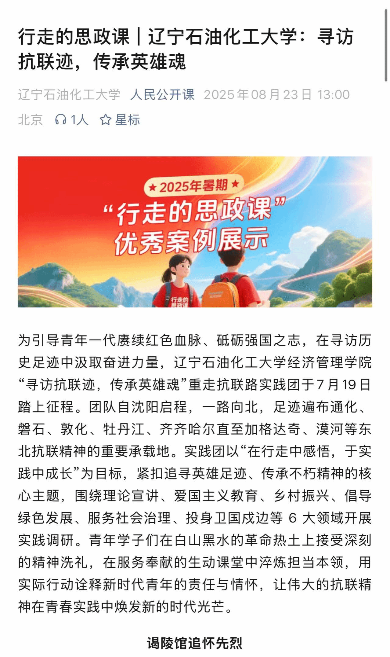 編者按:為引導青年一代賡續紅色血脈、砥礪強國之志,在尋訪歷史足跡中汲取奮進力量,遼寧石油化工大學經濟管理學院“尋訪抗聯跡,傳承英雄魂”重走抗聯路實踐團于7月19日踏上征程。團隊自沈陽啟程,一路向北,足跡遍布通化、磐石、敦化、牡丹江、齊齊哈爾直至加格達奇、漠河等東北抗聯精神的重要承載地。人民公開課微信公眾號對此進行了宣傳報道?,F將相關報道轉載如下: