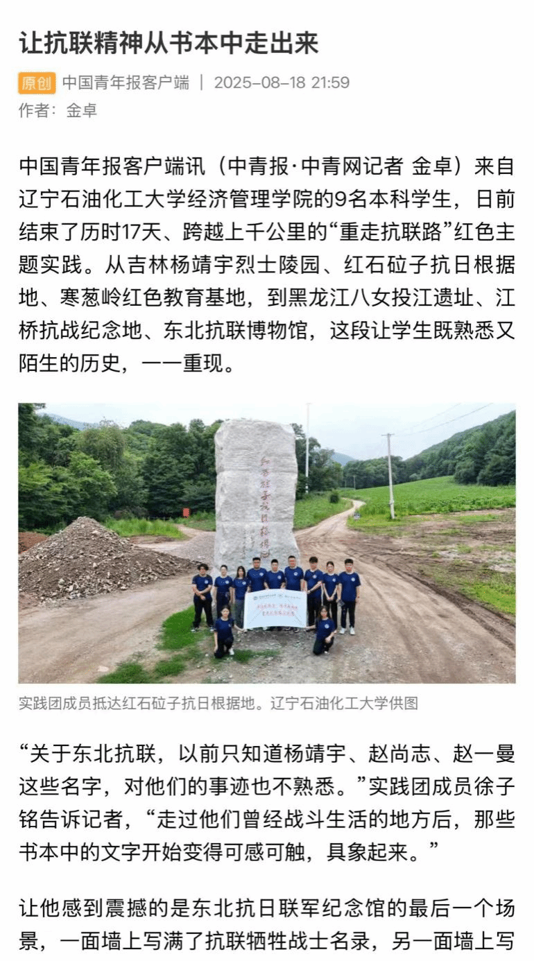 編者按:來自遼寧石油化工大學經濟管理學院的9名本科學生,結束了歷時17天、跨越上千公里的“重走抗聯路”紅色主題實踐。從吉林楊靖宇烈士陵園、紅石砬子抗日根據地、寒蔥嶺紅色教育基地,到黑龍江八女投江遺址、江橋抗戰紀念地、東北抗聯博物館,這段讓學生既熟悉又陌生的歷史,一一重現。中國青年報客戶端對此進行了宣傳報道?,F將相關報道轉載如下: