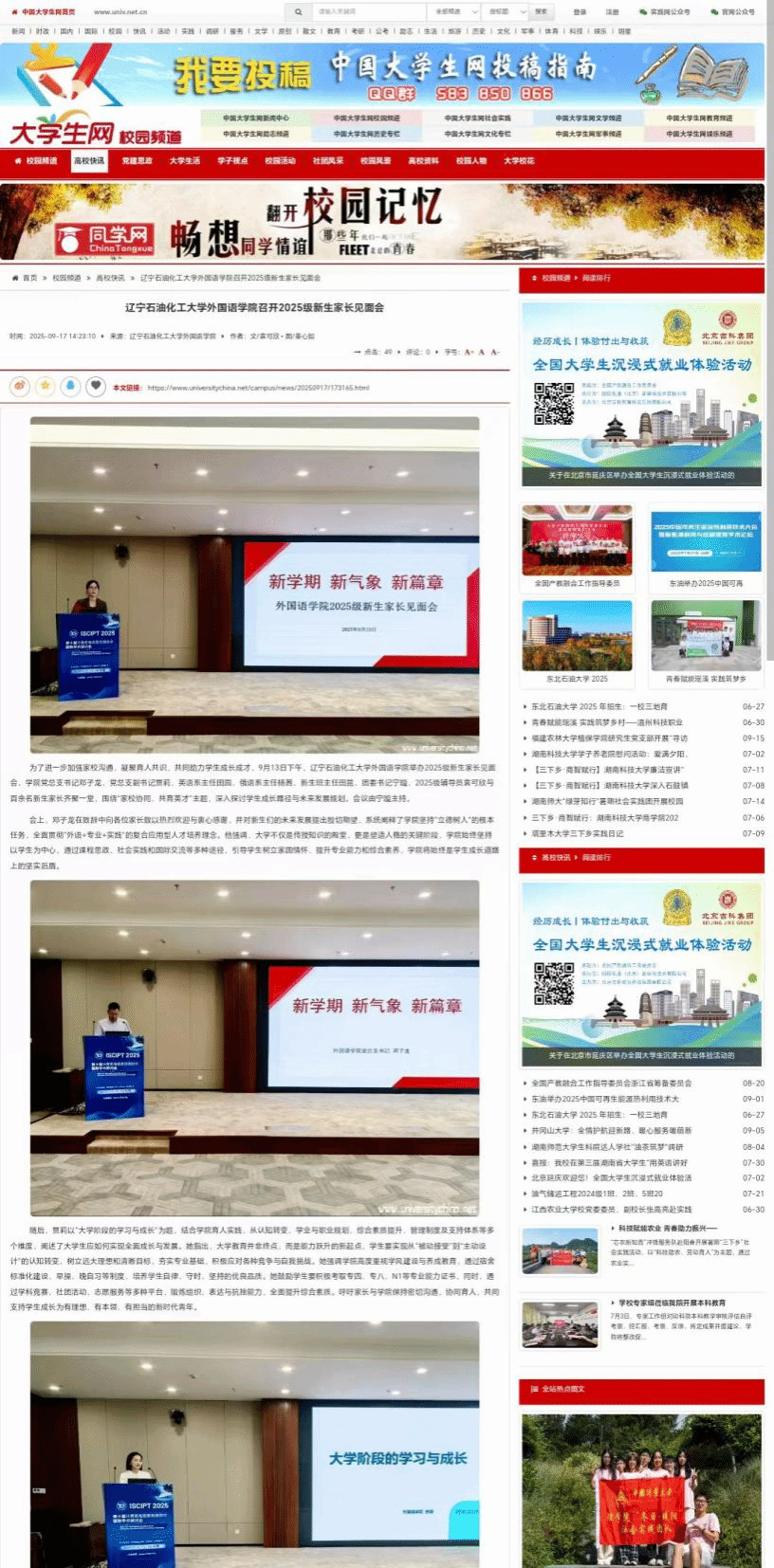 編者按:為了進一步加強家校溝通,凝聚育人共識,共同助力學生成長成才,9月13日下午,遼寧石油化工大學外國語學院舉辦2025級新生家長見面會。中國大學生網對其內容進行了宣傳報道,現將相關報道轉載如下: