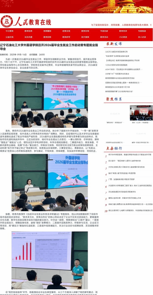 編者按:為進一步推進2026屆畢業生就業工作,幫助學生明晰職業方向、掌握求職技巧,提升就業競爭力,9月11日下午,遼寧石油化工大學外國語學院組織召開2026屆畢業生就業動員暨專題就業指導會。學習強國每周報社強國號、北國網、人民教育在線、中國大學生網對其內容進行了宣傳報道,現將相關報道轉載如下: