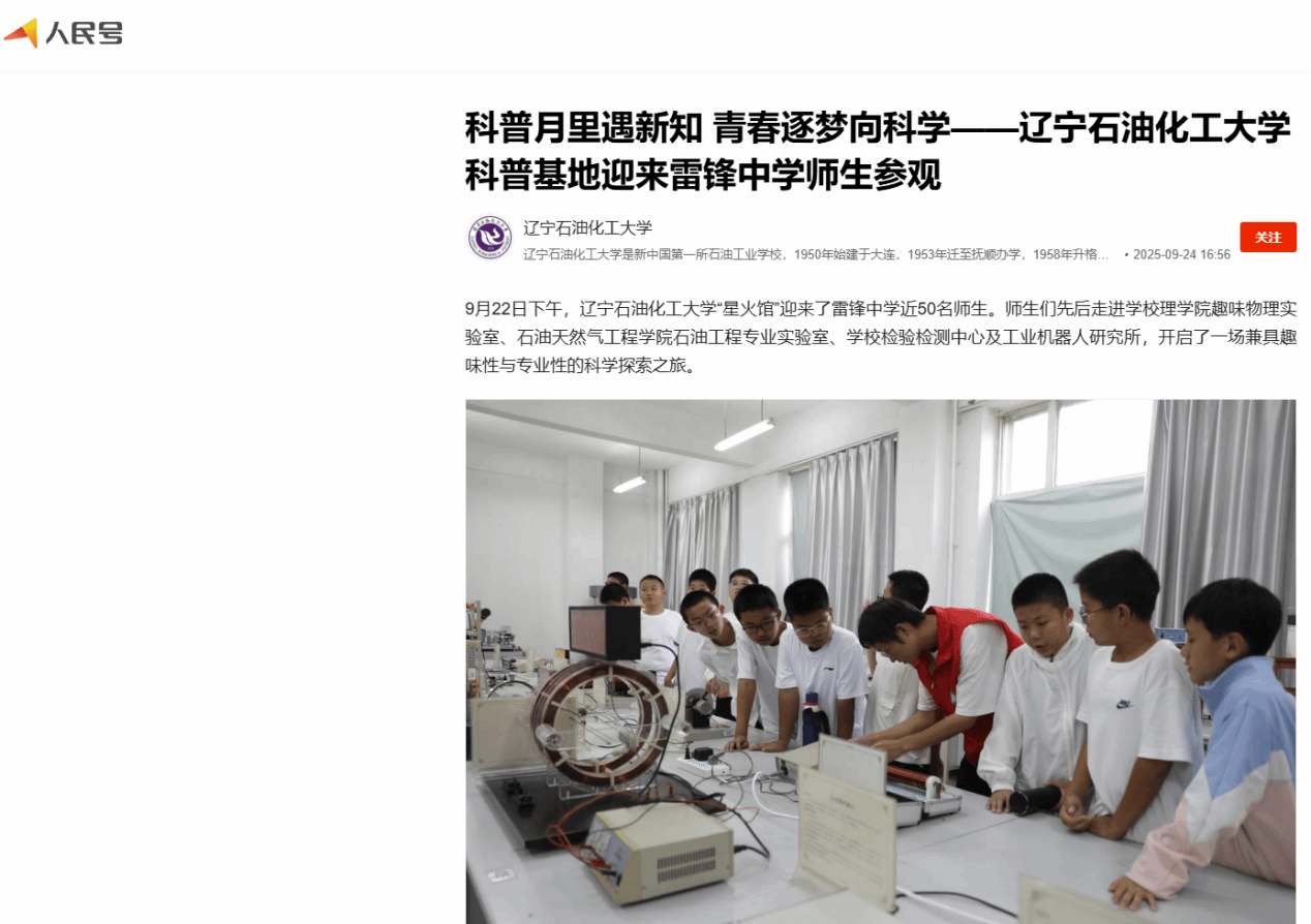編者按:9月22日下午,遼寧石油化工大學“星火館”迎來了雷鋒中學近50名師生。師生們先后走進學校理學院趣味物理實驗室、石油天然氣工程學院石油工程專業實驗室、學校檢驗檢測中心及工業機器人研究所,開啟了一場兼具趣味性與專業性的科學探索之旅。人民日報客戶端·人民號、遼寧日報·遼望號、搜狐號對其進行了宣傳報道,現將相關報道轉載如下: