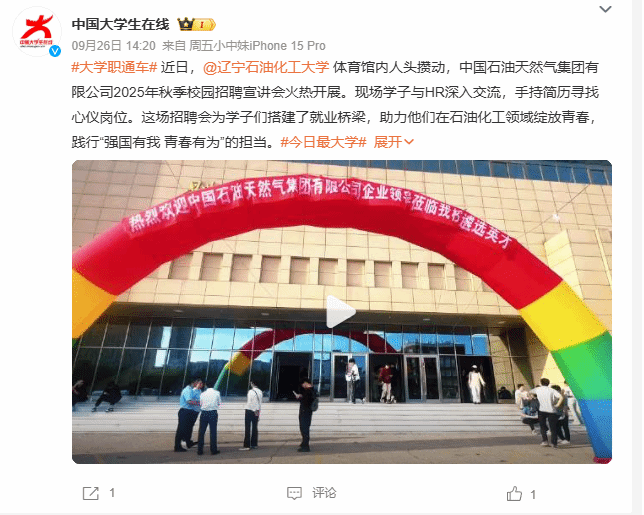 編者按:近日,學校體育館內人頭攢動,中國石油天然氣集團有限公司2025年秋季校園招聘宣講會火熱開展。現場學子與HR深入交流,手持簡歷尋找心儀崗位。這場招聘會為學子們搭建了就業橋梁,助力他們在石油化工領域綻放青春,踐行“強國有我 青春有為”的擔當。教育部中國大學生在線官方微博對此進行了宣傳報道?,F將相關報道轉載如下: