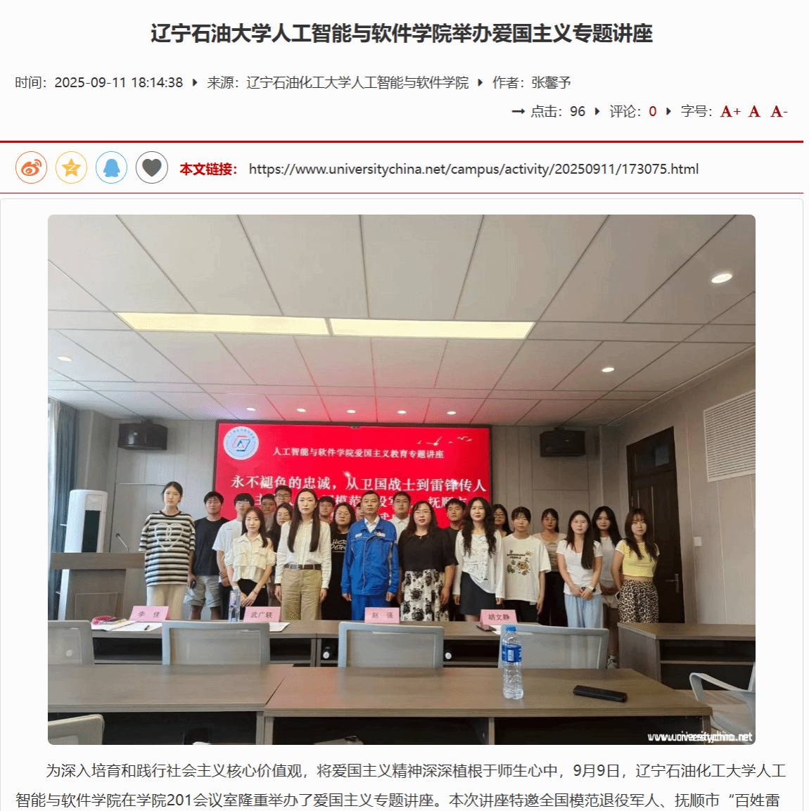 編者按:9月9日,遼寧石油化工大學人工智能與軟件學院在學院201會議室隆重舉辦了以“永不褪色的忠誠,從衛國戰士到雷鋒傳人”為主題的愛國主義專題講座。本次講座特邀全國模范退役軍人、撫順市“百姓雷鋒”、撫順石化公司石油三廠公共聯合車間武廣軼同志擔任主講嘉賓。講座讓師生深化對愛國精神的認識,激發擔當意識。中國大學生網對此進行了宣傳報道,現將相關報道轉載如下: