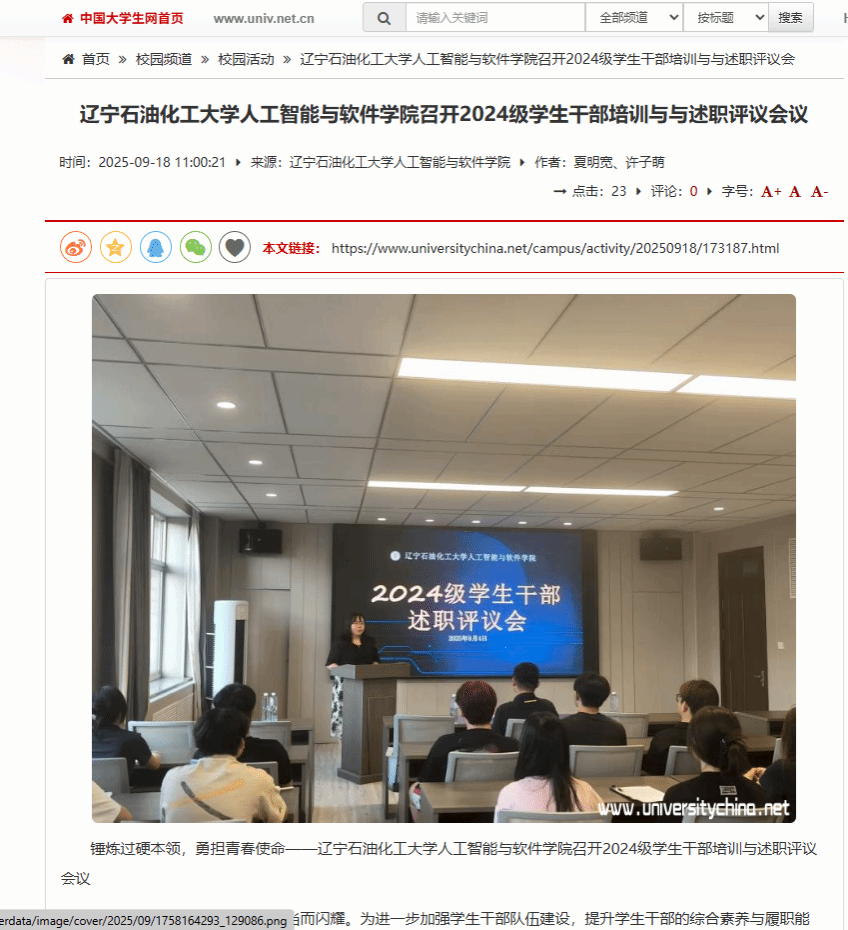 編者按:近日,為進一步加強學生干部隊伍建設,人工智能與軟件學院精心組織開展2024級學生干部培訓與述職評議工作,通過“培訓賦能+述職復盤”的模式,為新學期學生工作高質量開展注入新動力。中國大學生網對此進行了宣傳報道?,F將相關報道轉載如下: