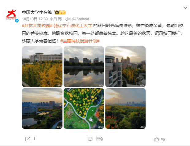編者按:學校的秋日時光滿是詩意,銀杏染成金黃,勾勒出校園的秀美輪廓。俯瞰金秋校園,每一處都藏著驚喜。趁這最美的秋天,新媒體中心趙英睿用航拍機記錄了校園模樣,珍藏大學青春記憶!中國大學生在線官方微博對此進行了宣傳報道?,F將相關報道轉載如下: