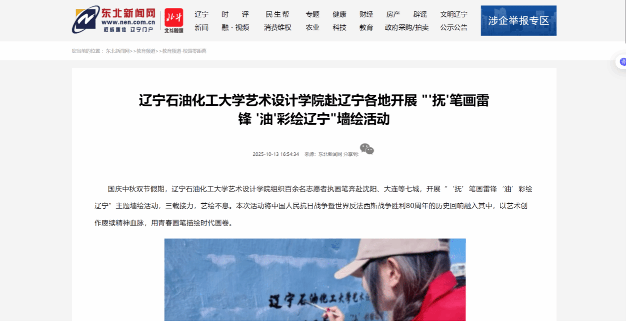 編者按:國慶中秋雙節假期,遼寧石油化工大學藝術設計學院組織百余名志愿者執畫筆奔赴沈陽、大連等七城,開展“‘撫’筆畫雷鋒 ‘油’彩繪遼寧”主題墻繪活動。以藝術創作賡續精神血脈,用青春畫筆描繪時代畫卷。東北新聞網對此進行了報道?,F將相關報道轉載如下: