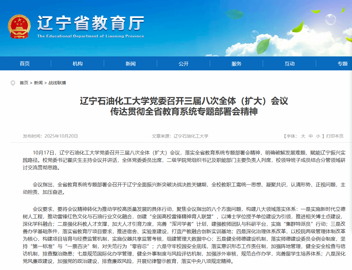 編者按:10月17日,遼寧石油化工大學黨委召開三屆八次全體(擴大)會議,落實全省教育系統專題部署會精神,明確破解發展難題、賦能遼寧振興實踐路徑。遼寧省教育廳官網對此進行了宣傳報道?,F將相關報道轉載如下: