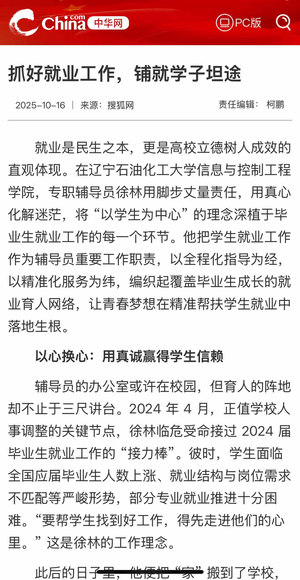 編者按:近日,中華網 、人民教育在線、中國網等媒體平臺對我校徐林老師撰寫的“抓好就業工作,鋪就學子坦途”的文章進行了轉載報道?,F將相關報道轉載如下: