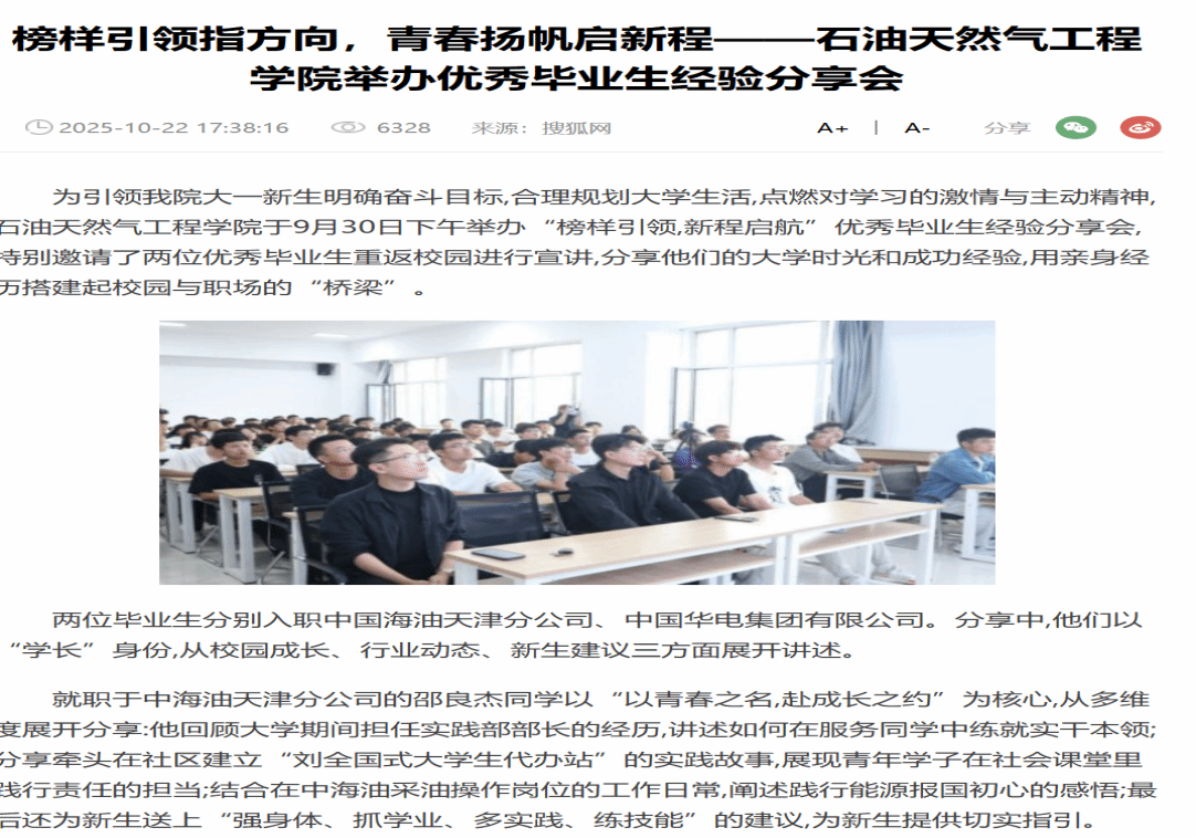 編者按:為引領我院大一新生明確奮斗目標,合理規劃大學生活,點燃對學習的激情與主動精神,石油天然氣工程學院于9月30日下午舉辦“榜樣引領,新程啟航”優秀畢業生經驗分享會,特別邀請了兩位優秀畢業生重返校園進行宣講,分享他們的大學時光和成功經驗,用親身經歷搭建起校園與職場的“橋梁”。中華網對此進行了宣傳報道。現將相關報道轉載如下: