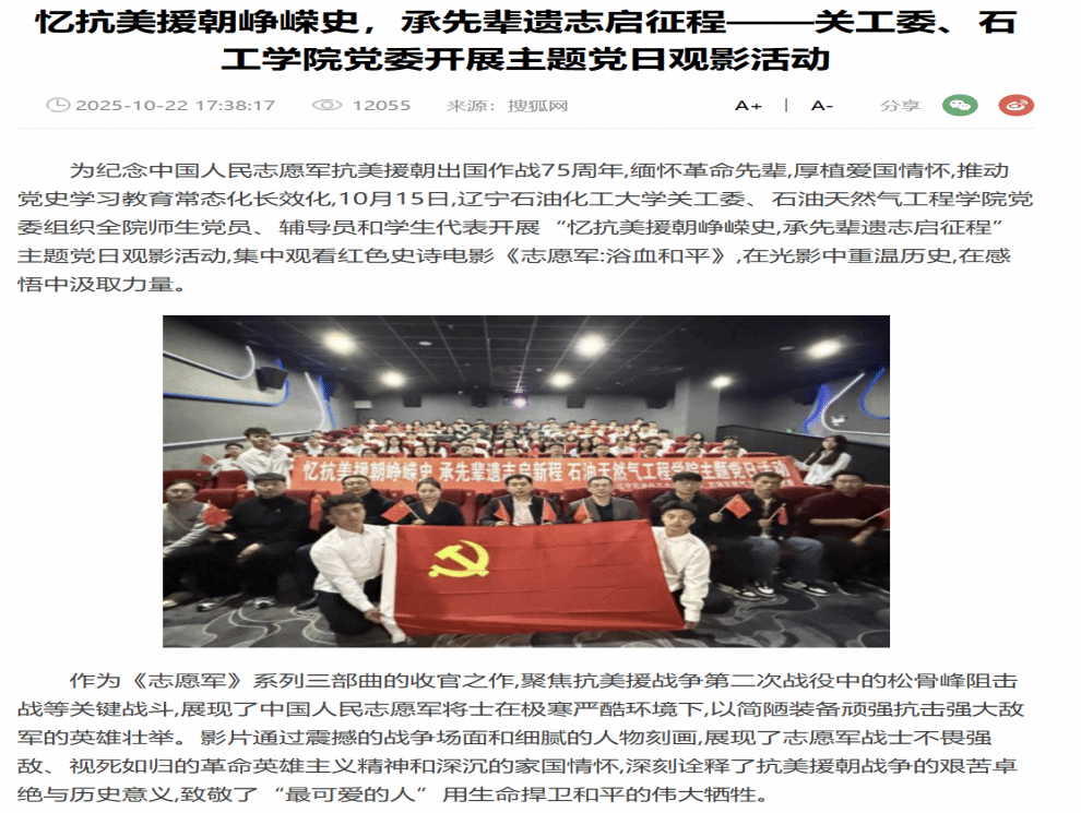 編者按:10月15日,遼寧石油化工大學關工委、石油天然氣工程學院黨委組織全院師生黨員、輔導員和學生代表開展“憶抗美援朝崢嶸史,承先輩遺志啟征程”主題黨日觀影活動,集中觀看紅色史詩電影《志愿軍:浴血和平》,在光影中重溫歷史,在感悟中汲取力量。中華網對此進行了宣傳報道?,F將相關報道轉載如下: