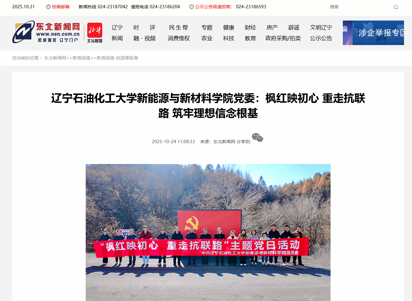 編者按:為深化黨史學習教育成果,筑牢理想信念之基,近日,遼寧石油化工大學新能源與新材料學院黨委組織學院師生黨員代表,赴撫順市清原滿族自治縣開展“楓紅映初心·重走抗聯路”主題黨日活動。東北新聞網、中國大學生網對此進行了宣傳報道,現將相關報道轉載如下: