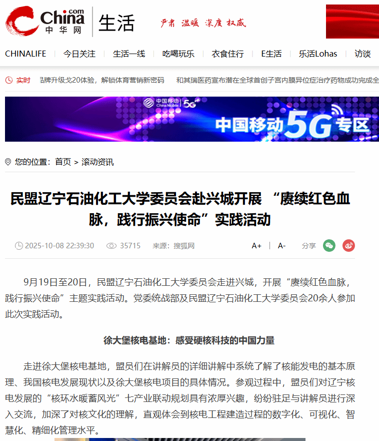 編者按:近日,中華網對我校民盟主委張海娟撰寫的文章《民盟遼寧石油化工大學委員會赴興城開展“賡續紅色血脈,踐行振興使命”實踐活動》進行了宣傳報道?,F將相關報道轉載如下: