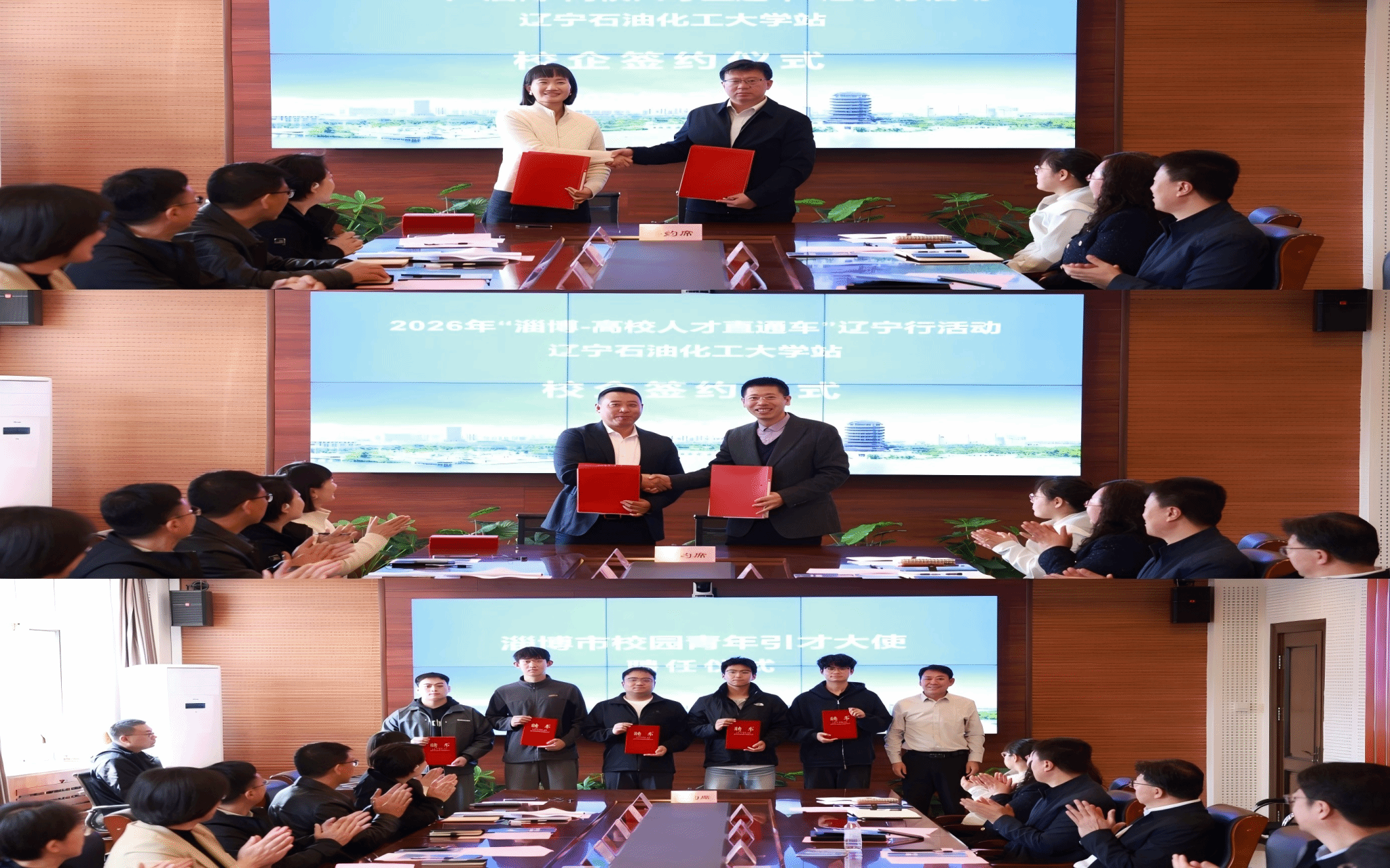 隨后,王潤芹介紹全市引才情況,區縣相關負責同志解讀地方產業發展情況,企業代表宣講崗位需求和合作意向。山東勝越石化工程建設有限公司總經理張東與石油化工學院黨委副書記李勇、英科再生資源股份有限公司行政總監與機械工程學院黨委副書記馬喜龍簽訂了校企就業見習合作協議。市人社局陳志林主任向部分淄博籍大學生頒發2026年“淄博市校園青年引才大使”聘書。