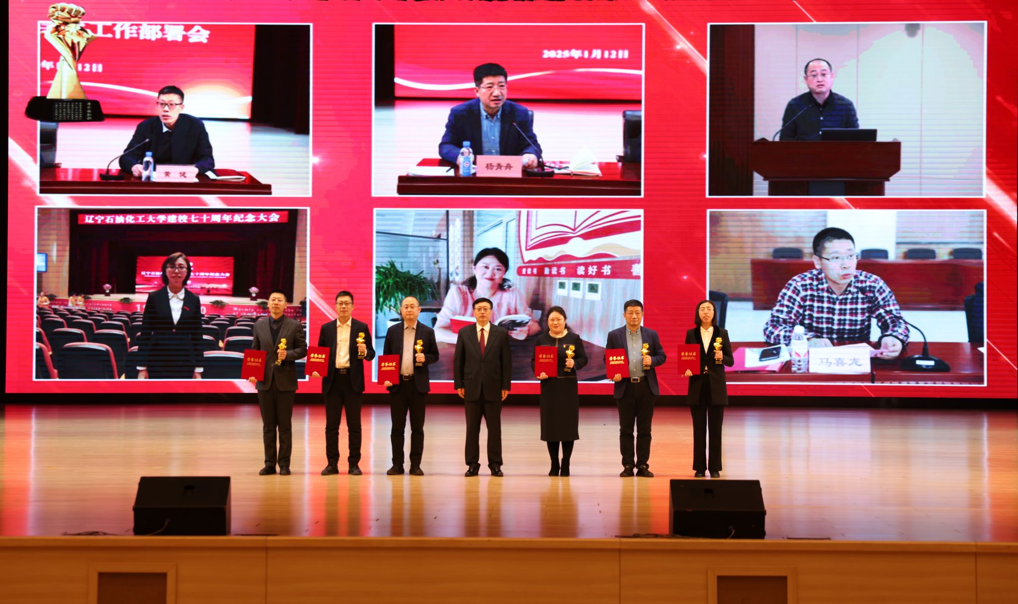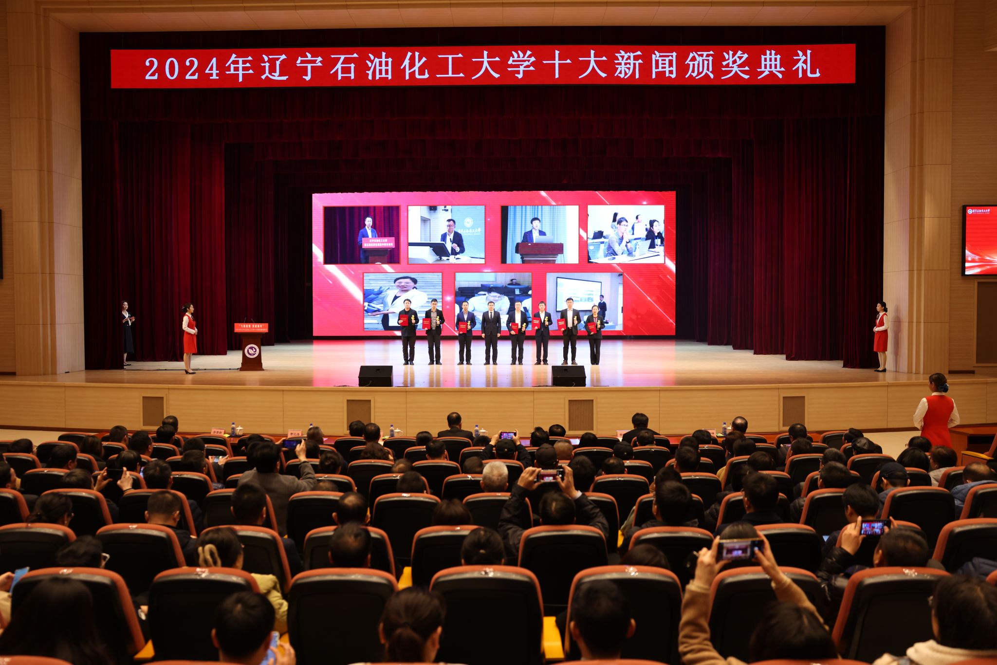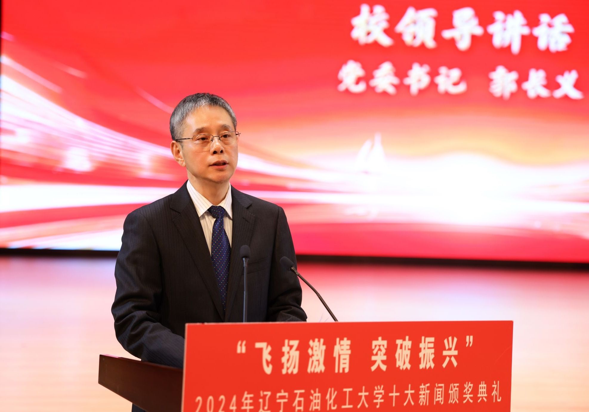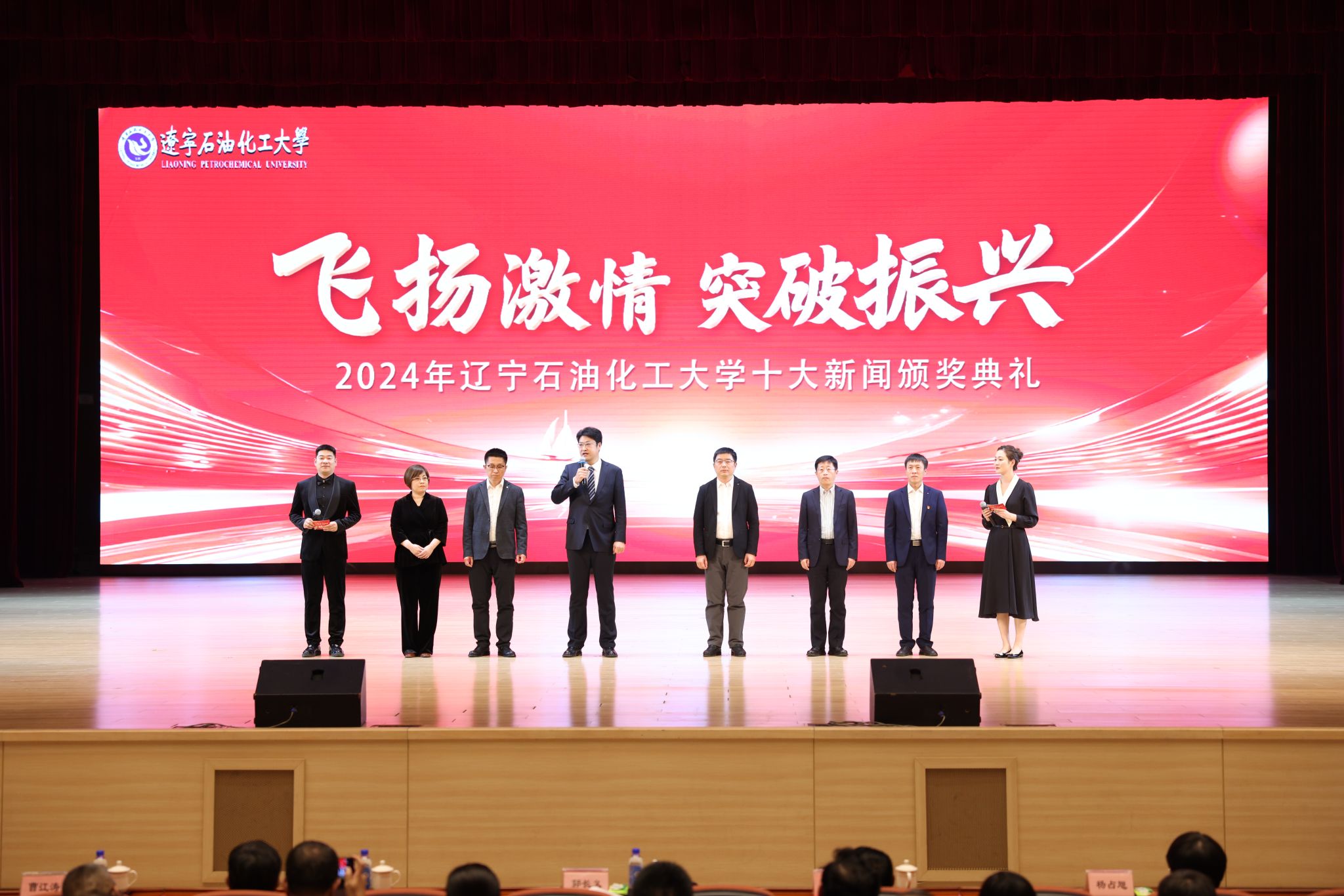 在頒獎典禮上,依次以視頻形式公布了十大新聞,宣讀了頒獎詞及獲獎名單。校領導依次為十大新聞獲獎者頒獎。在獲獎代表發言環節,黨委組織部王強、發展規劃處李焱斌、石油化工學院王吉林、繼續教育學院趙俠、招生就業辦公室趙曉東、后勤集團黃春雷6位代表,分享了他們的感受與決心,表達了對學校發展,尤其是增列博士授權單位關鍵目標的美好期許。他們立足崗位講奉獻、勇于創新求突破、腳踏實地踐使命、聚焦要事談展望,以一張藍圖繪到底、一鼓作氣不松勁的決心銳意進取、篤行實干,詮釋著“問學穿石,修身誠化”的校訓精神,展現著遼石化大人的堅韌與智慧。