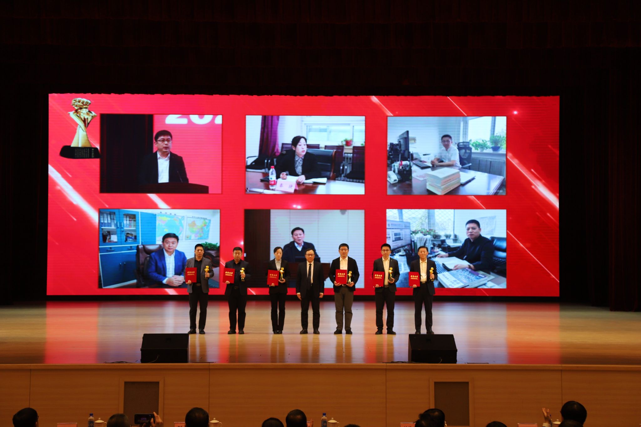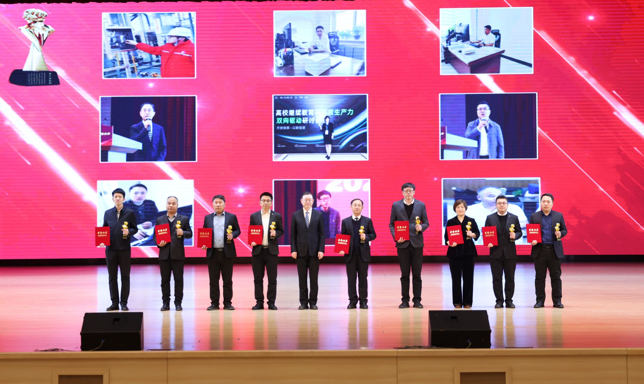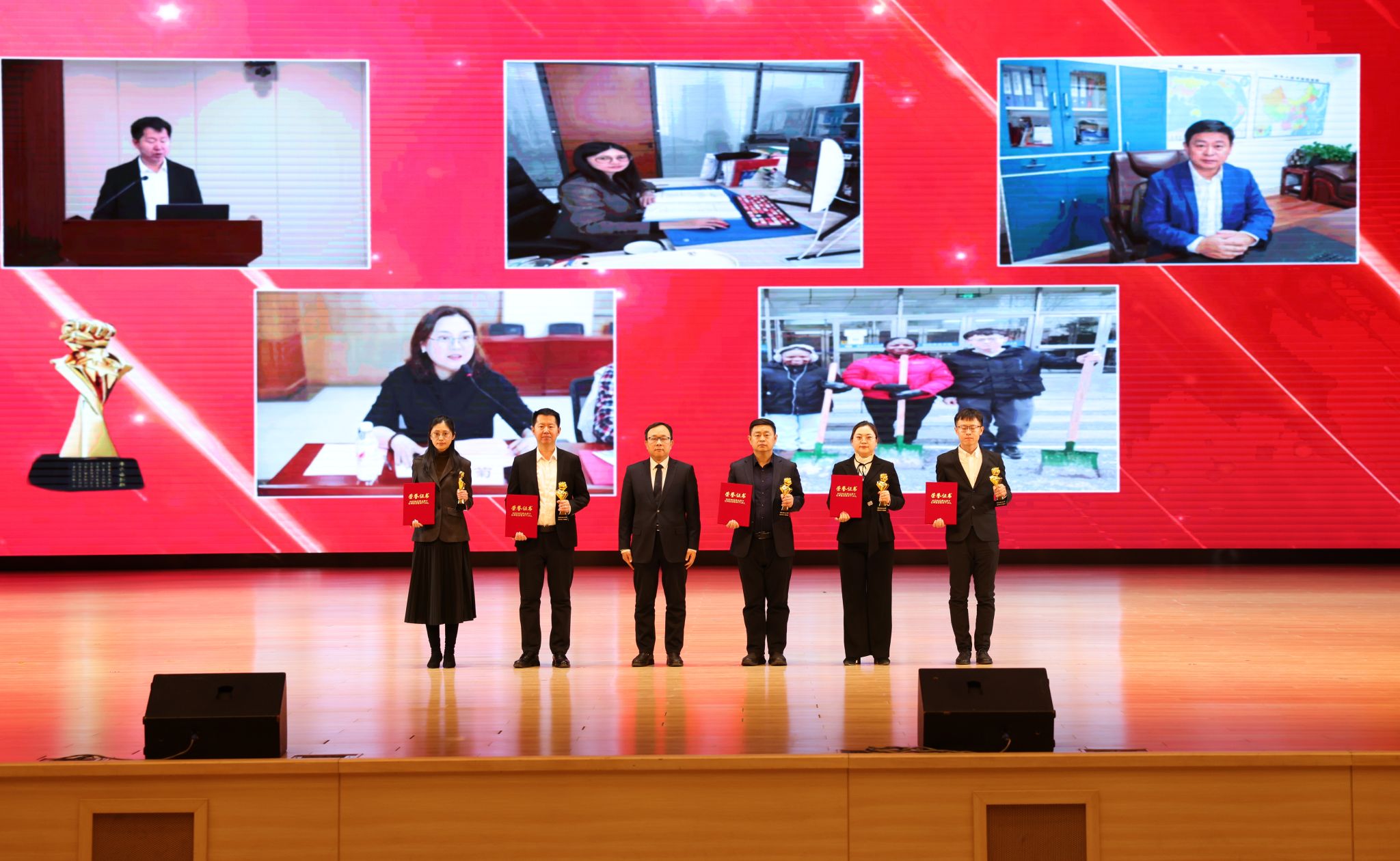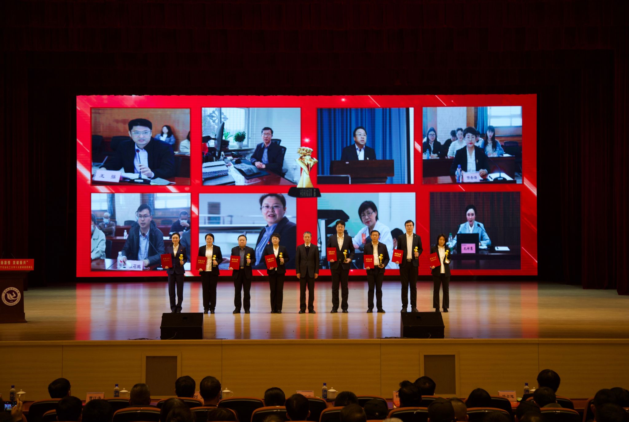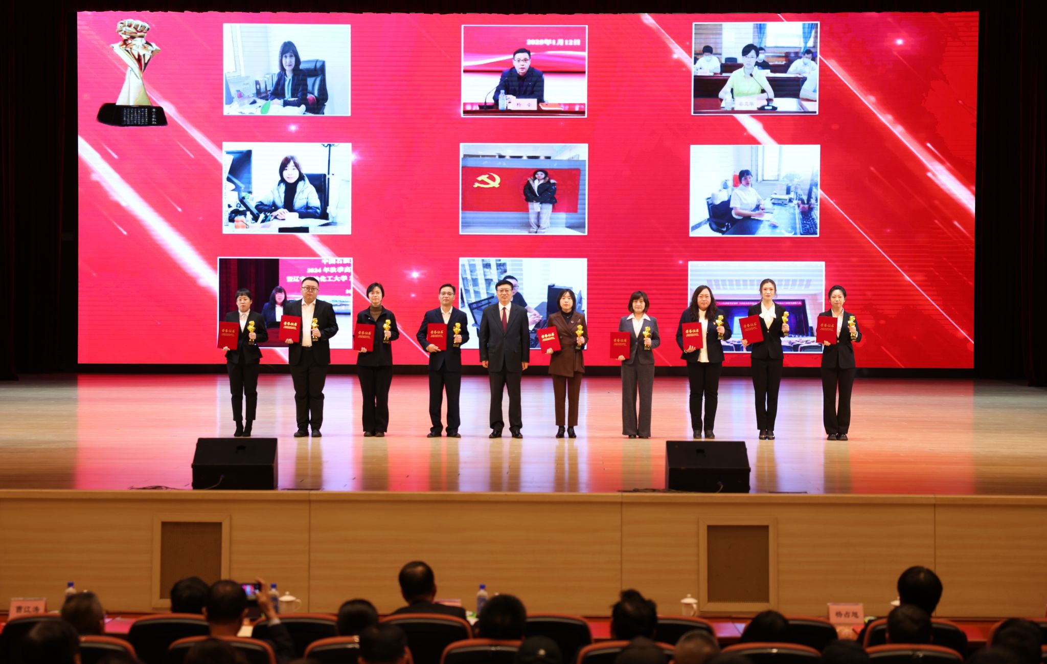 在頒獎典禮上,依次以視頻形式公布了十大新聞,宣讀了頒獎詞及獲獎名單。校領導依次為十大新聞獲獎者頒獎。在獲獎代表發言環節,黨委組織部王強、發展規劃處李焱斌、石油化工學院王吉林、繼續教育學院趙俠、招生就業辦公室趙曉東、后勤集團黃春雷6位代表,分享了他們的感受與決心,表達了對學校發展,尤其是增列博士授權單位關鍵目標的美好期許。他們立足崗位講奉獻、勇于創新求突破、腳踏實地踐使命、聚焦要事談展望,以一張藍圖繪到底、一鼓作氣不松勁的決心銳意進取、篤行實干,詮釋著“問學穿石,修身誠化”的校訓精神,展現著遼石化大人的堅韌與智慧。
