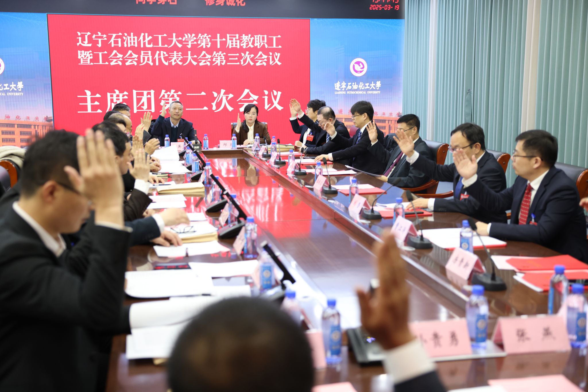 13時30分,主席團第二次會議聽取了各代表團討論情況的匯報,審議了行政工作報告決議(草案)、工會工作報告決議(草案)、財務工作報告決議(草案)、《遼寧石油化工大學章程(2025年修訂)》決議(草案)。