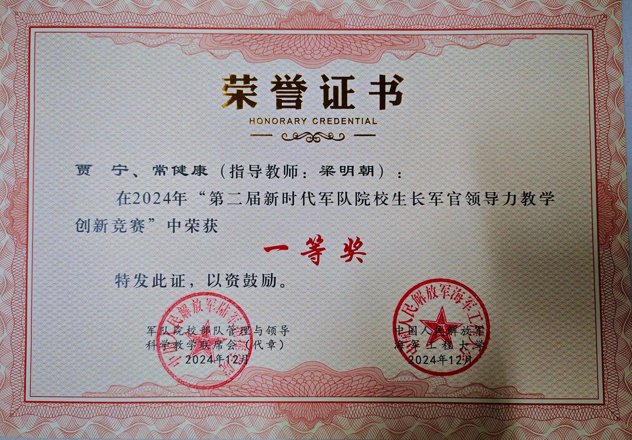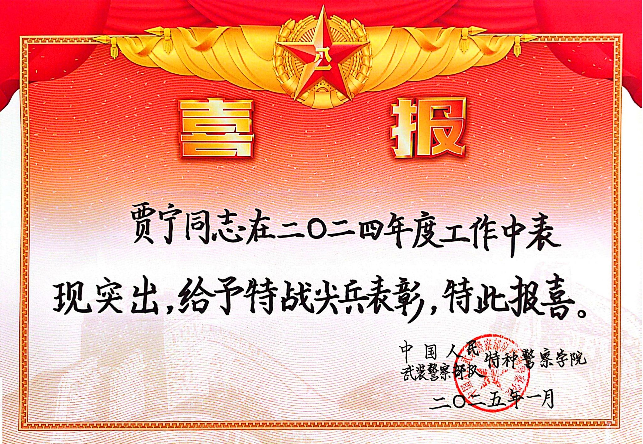近日,中國人民武裝警察部隊特種警察學院向學校發來喜報。我校原能源化工工程專業1701班學生,現中國人民武裝警察部隊特種警察學院學員賈寧,在2024年12月舉辦的第二屆新時代全軍院校生長軍官領導力培養教學創新競賽中榮獲全軍一等獎。2025年1月,被武警特種警察學院評為“特戰尖兵”,榮獲三級表彰,記嘉獎一次。