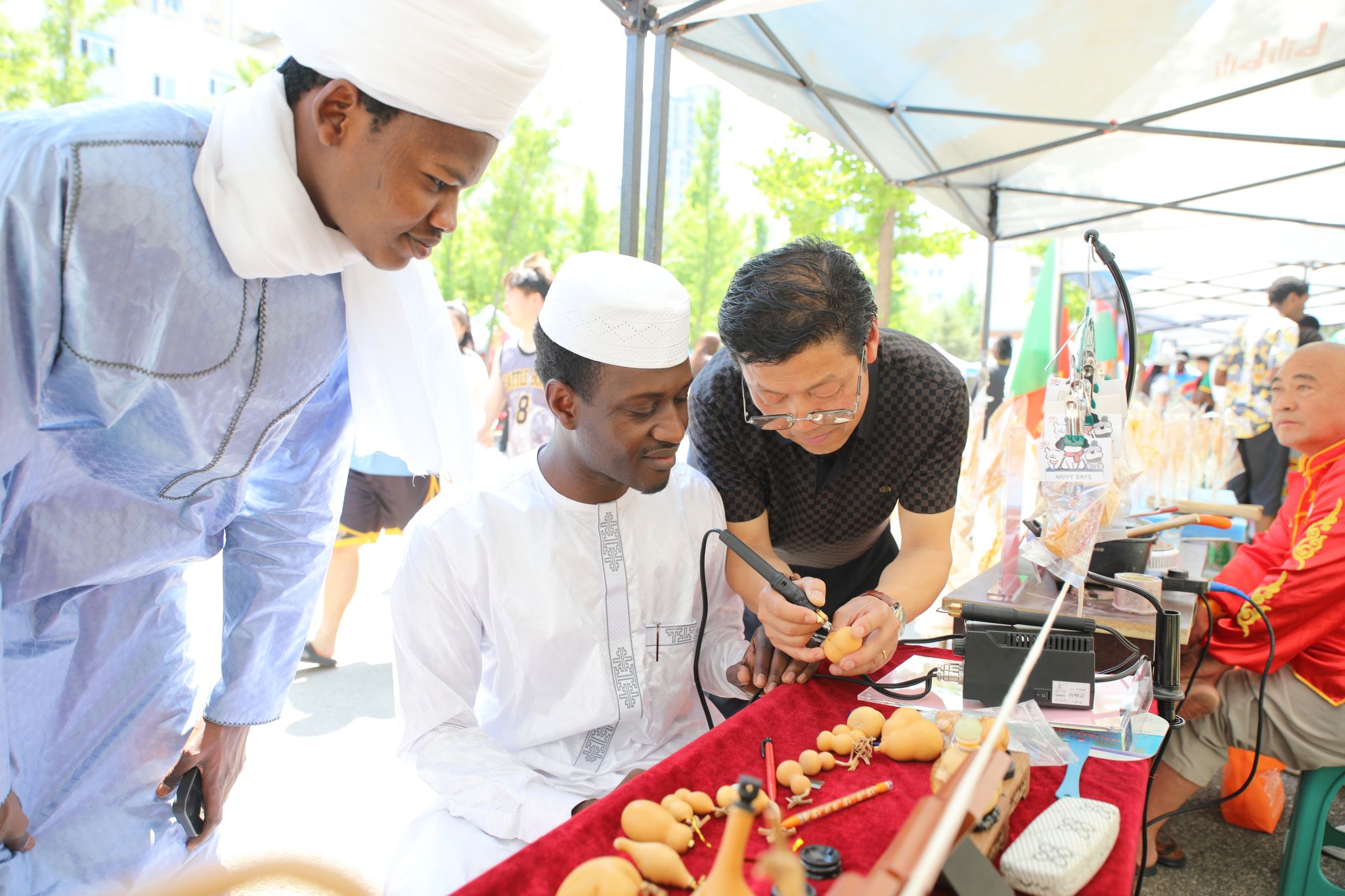 文化展臺區域熱鬧非凡,現場設置的10余個展臺,承載著來自眾多國家以及不同地區的特色文化,吸引著眾人駐足探索。眾多師生紛紛慕名而來,積極參與互動活動,認真收集紀念印章,熱情地與各國學生交流合影。大家在輕松愉悅的氛圍中領略多元文化的魅力。傳統的葫蘆畫、糖人制作技藝引得留學生們贊嘆不已,紛紛對中國手藝人精湛的技藝豎起大拇指。