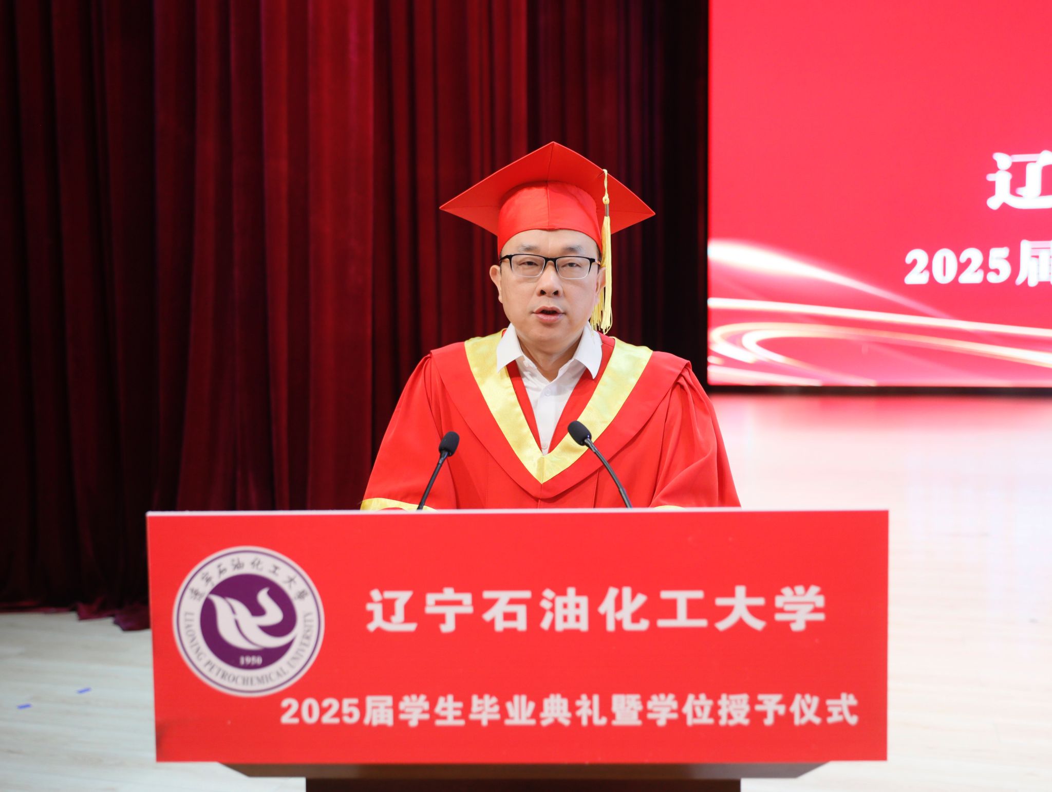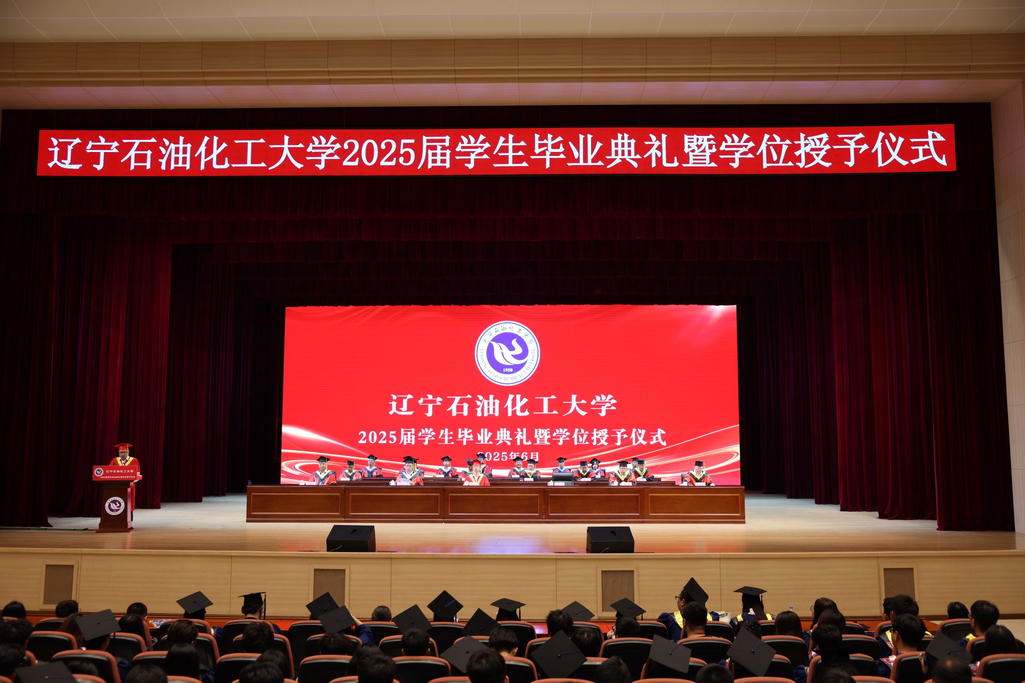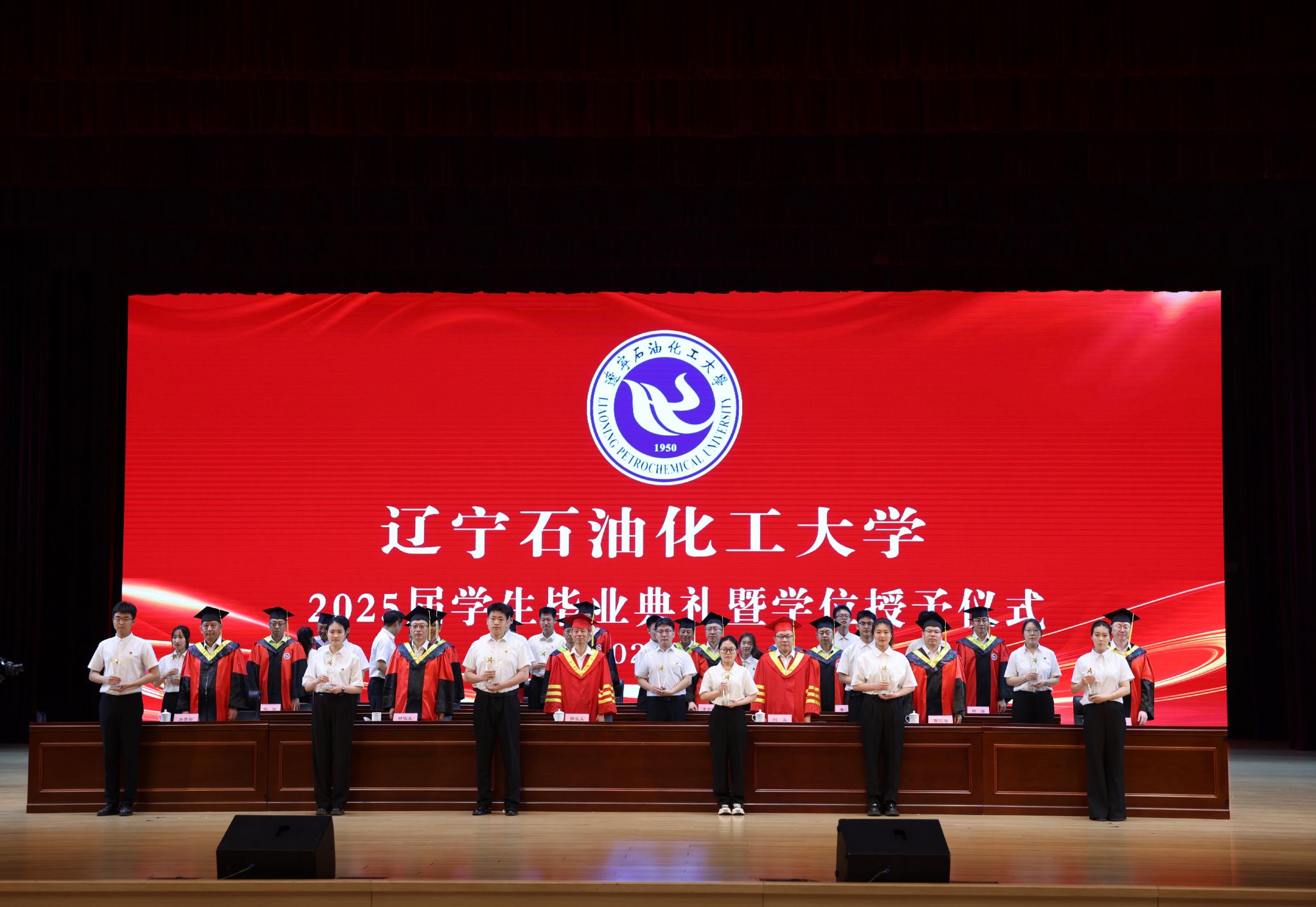 劉海峰宣讀2025屆畢業生“校園之星”表彰決定,授予戰禹諾等25名學生“遼寧石油化工大學校園之星”榮譽稱號。主席臺上領導嘉賓為校園之星獲獎代表頒發獎杯,激勵全體畢業生以榜樣為力量,奮勇向前。