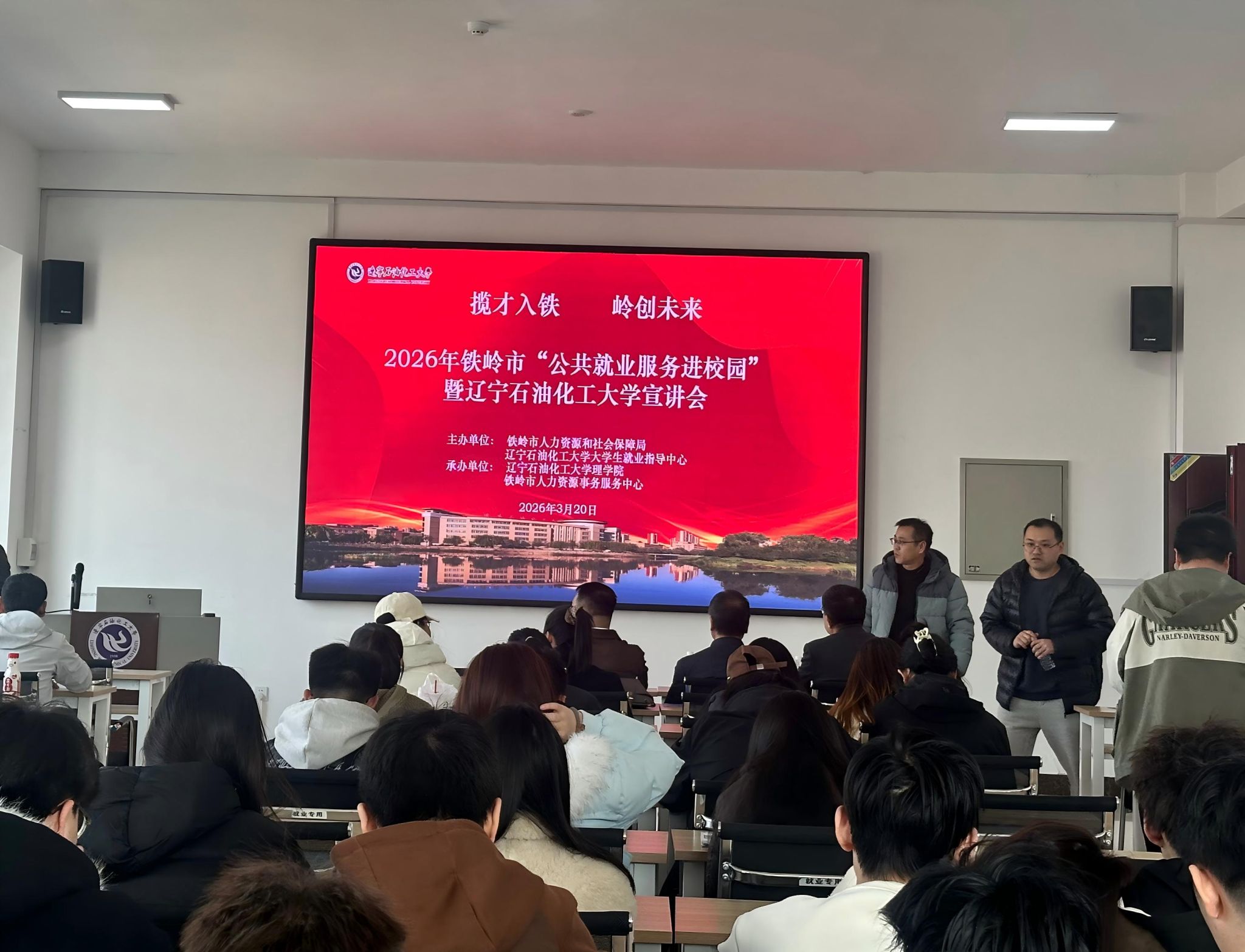 活動現(xiàn)場首先播放鐵嶺城市宣傳片《奮起攻堅 筑夢鐵嶺》,全面展現(xiàn)鐵嶺城市風(fēng)貌、產(chǎn)業(yè)布局、發(fā)展?jié)摿εc宜居宜業(yè)環(huán)境,讓在場學(xué)子直觀感受鐵嶺振興發(fā)展的蓬勃態(tài)勢。我校大學(xué)生就業(yè)指導(dǎo)中心主任楊青舟致辭,介紹了學(xué)校人才培養(yǎng)與就業(yè)服務(wù)工作成果,表達了依托前期訪企拓崗基礎(chǔ)、深化校地合作、助力畢業(yè)生留遼留鐵就業(yè)創(chuàng)業(yè)的堅定意愿。鐵嶺市人力資源和社會保障局副局長胡巍圍繞鐵嶺市情、產(chǎn)業(yè)優(yōu)勢、人才發(fā)展平臺做了專題宣講,向廣大青年發(fā)出留鐵就業(yè)、共創(chuàng)未來的誠摯邀請。鐵嶺市人力資源事務(wù)服務(wù)中心負責(zé)人聚焦畢業(yè)生關(guān)切,詳細解讀鐵嶺市高校畢業(yè)生就業(yè)創(chuàng)業(yè)補貼、安居保障、落戶支持、創(chuàng)業(yè)扶持等政策,把惠才紅利講清講透,切實提升政策知曉度與獲得感。