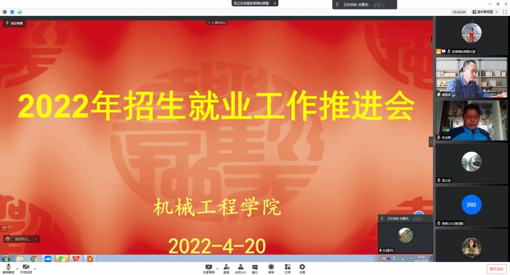 4月20日下午,機(jī)械工程學(xué)院黨委在線上召開了學(xué)院2022年招生就業(yè)工作推進(jìn)會。傳達(dá)學(xué)校會議精神,學(xué)習(xí)學(xué)校招生就業(yè)工作文件,總結(jié)學(xué)院2021年招生就業(yè)工作,對2022年招生就業(yè)工作做出具體安排。黨委書記張金輝主持會議,院領(lǐng)導(dǎo)、各部門黨政負(fù)責(zé)人、輔導(dǎo)員、招生工作承包教師及學(xué)生志愿者共45人參加了會議。