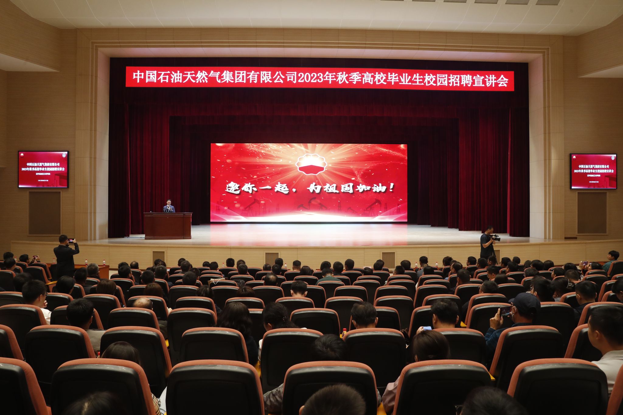 與會(huì)師生首先集體觀看了中國石油2023年秋季高校畢業(yè)生校園招聘宣傳片,總覽了大國央企磅礴氣勢、宏大布局和深厚積淀,初步了解中國“第一桶油”各項(xiàng)業(yè)務(wù)。