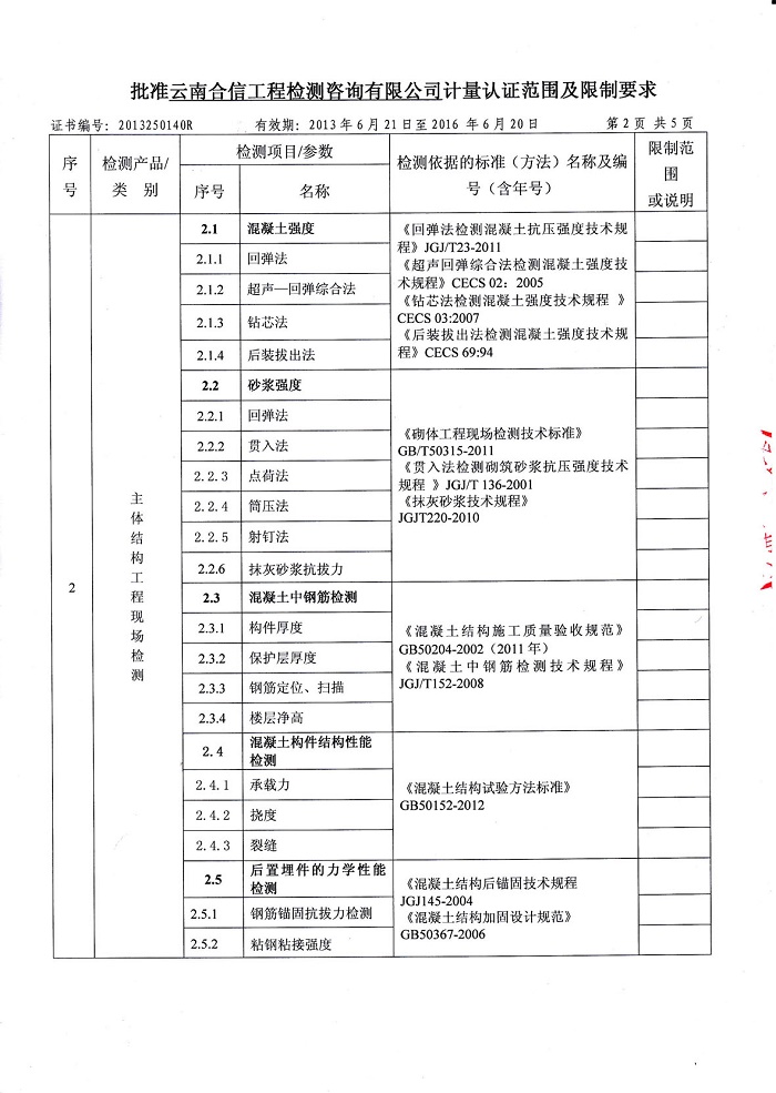云南合信工程檢測咨詢有限公司主體結構工程檢測主要能力為: