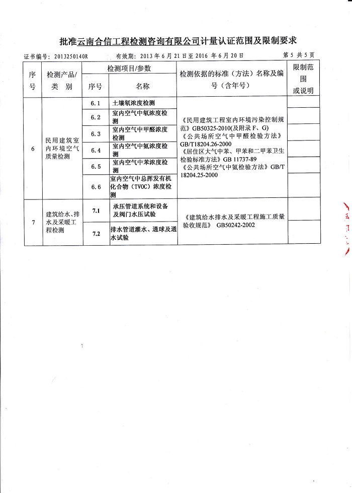 民用建筑室內環境空氣質量檢測能力: