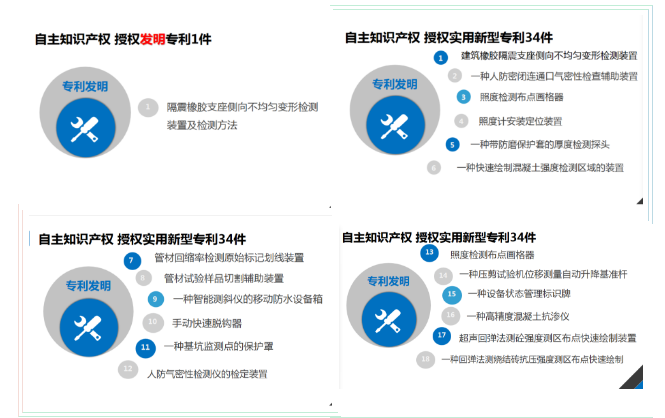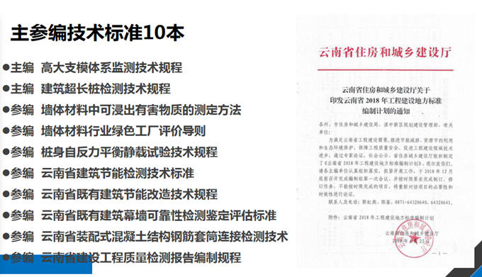 獲評(píng)”云南省知識(shí)產(chǎn)權(quán)優(yōu)勢(shì)企業(yè)”榮譽(yù)稱(chēng)號(hào),是上級(jí)對(duì)云南合信公司科技成果的肯定,也是公司重視科技創(chuàng)新的重要體現(xiàn)。云南合信公司始終把創(chuàng)新作為引領(lǐng)企業(yè)發(fā)展的第一動(dòng)力,一直非常重視知識(shí)產(chǎn)權(quán)對(duì)企業(yè)效益的提升作用,高位推進(jìn)技術(shù)創(chuàng)新工作。截止目前,公司申報(bào)自主知識(shí)產(chǎn)權(quán)專(zhuān)利44件(含發(fā)明專(zhuān)利3項(xiàng)),已授權(quán)35件(含發(fā)明專(zhuān)利1項(xiàng))。新立科研項(xiàng)目6個(gè),在研項(xiàng)目12個(gè),已出成果10項(xiàng)。公司主參編技術(shù)標(biāo)準(zhǔn)10本,其中主編地標(biāo)2本,參編國(guó)標(biāo)1本、行標(biāo)1本、地標(biāo)6本。2020年,公司新申報(bào)主編地方標(biāo)準(zhǔn)《高大支模體系監(jiān)測(cè)技術(shù)規(guī)程》和《建筑超長(zhǎng)樁檢測(cè)技術(shù)規(guī)程》已通過(guò)立項(xiàng)審查,并已啟動(dòng)編制工作;參編《墻體材料中可浸出有害物質(zhì)的測(cè)定方法》、《墻體材料行業(yè)綠色工廠評(píng)價(jià)導(dǎo)則》已完成報(bào)批;參編地方標(biāo)準(zhǔn)《云南省建筑抗震支吊架檢測(cè)及施工驗(yàn)收技術(shù)規(guī)程》已完成所負(fù)責(zé)章節(jié)的編寫(xiě)工作。