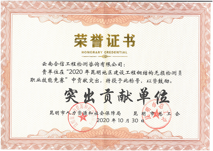 同時,我司作為技術支持單位協助云南省工程檢測協會舉辦了2020年昆明地區建設工程鋼結構無損檢測員職業技能競賽活動。此次技能競賽選拔出了一批技藝精湛、善于解決技術難題的技術尖兵,不僅使檢測機構有效地判斷自身鋼結構無損檢測的水平,取長補短,也促進昆明市地區建筑工程檢測行業鋼結構檢測整體水平的提升。在此次技能競賽活動中我司提供了大力支持、表現突出,因此獲得了由昆明市人力資源和社會保障局、昆明市總工會頒發的突出貢獻獎獎牌和榮譽證書。
