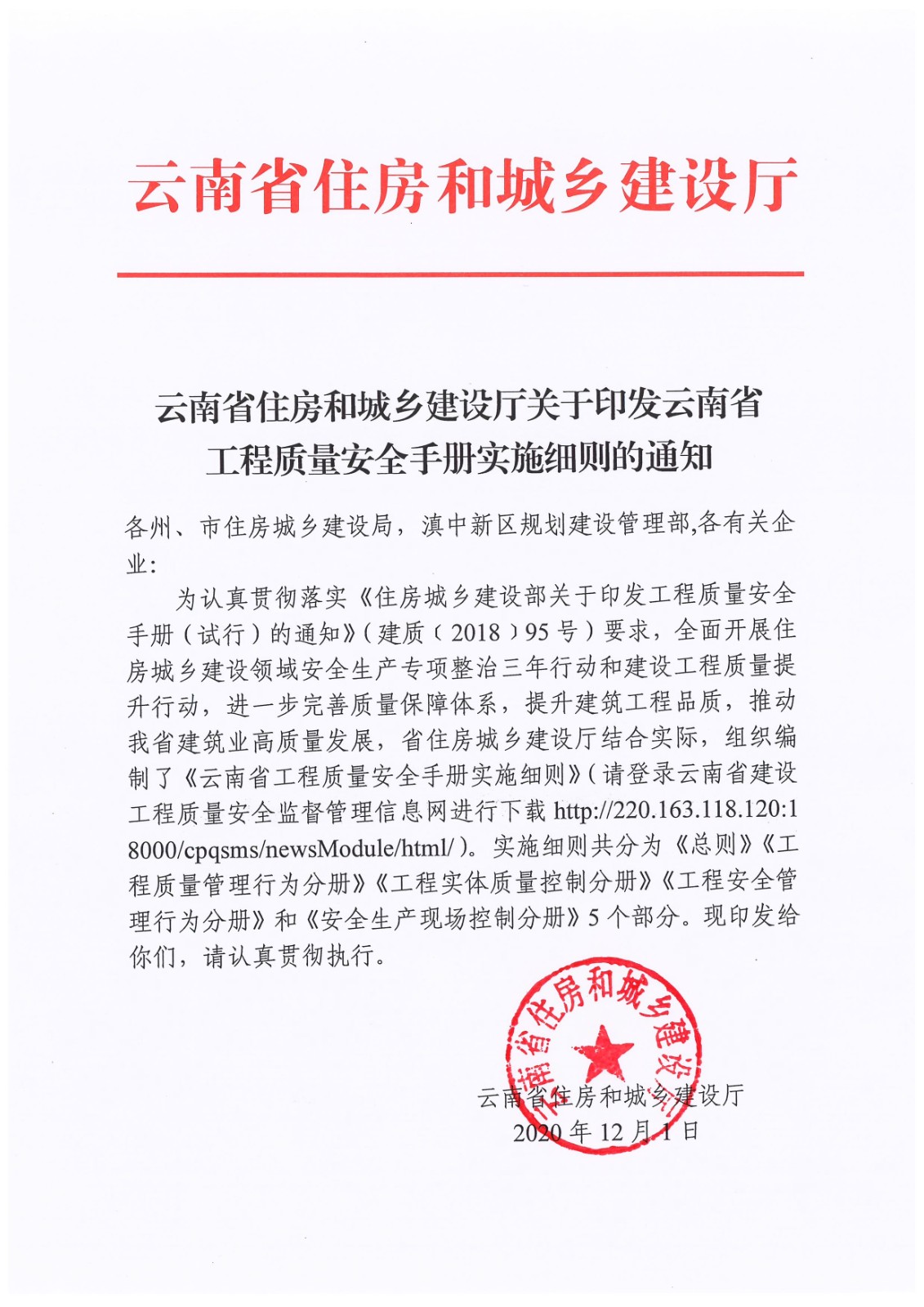 云南省住房和城鄉(xiāng)建設(shè)廳關(guān)于印發(fā)云南省工程質(zhì)量安全手冊(cè)實(shí)施細(xì)則的通知