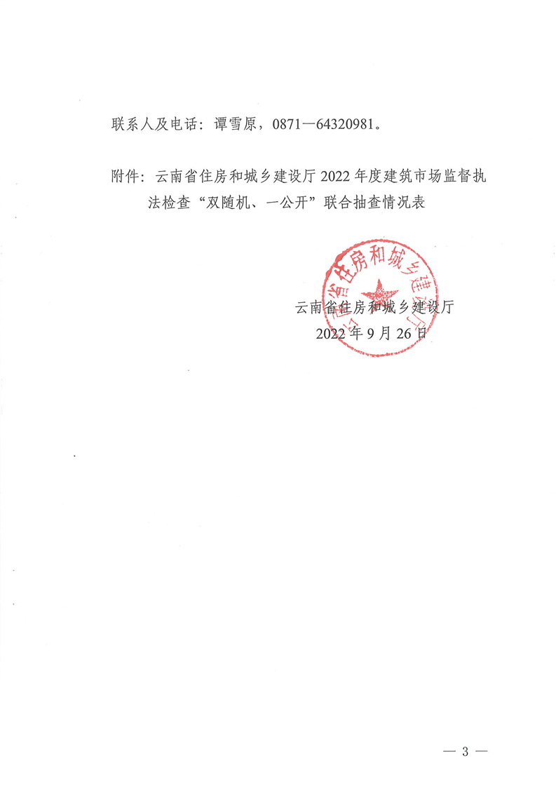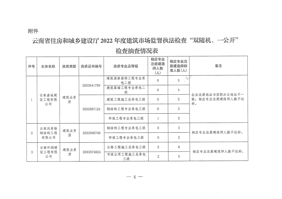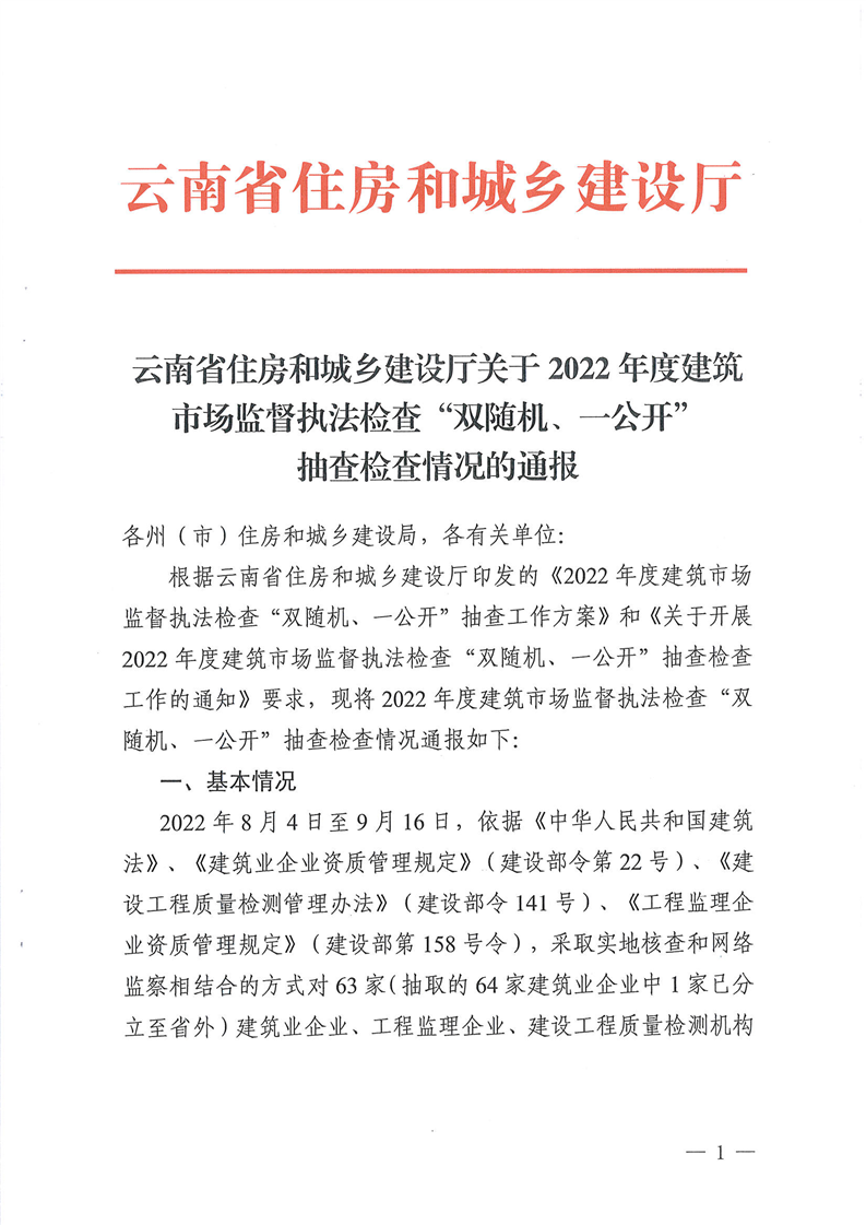 云南省住房和城鄉建設廳關于2022年度建筑市場監督執法檢查“雙隨機、一公開”抽查檢查情況的通報