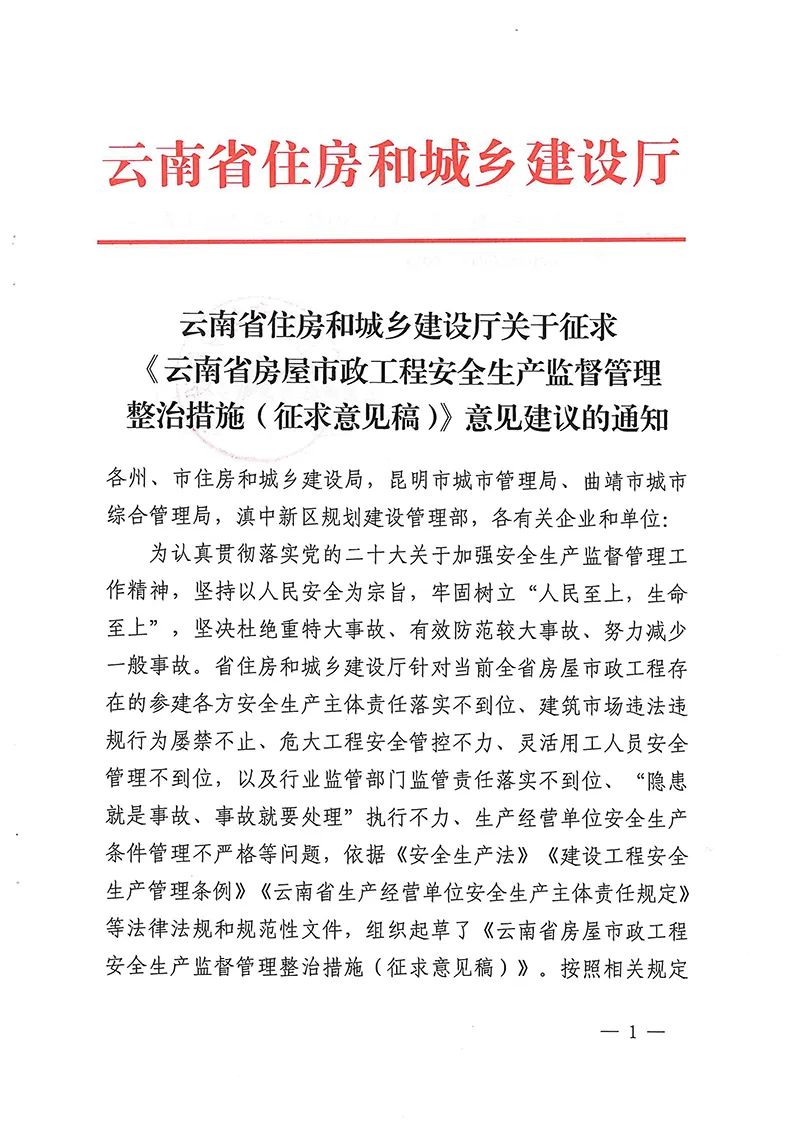 云南省住房和城鄉建設廳關于征求 《云南省房屋市政工程安全生產監督管理整治措施(征求意見稿)》意見建議