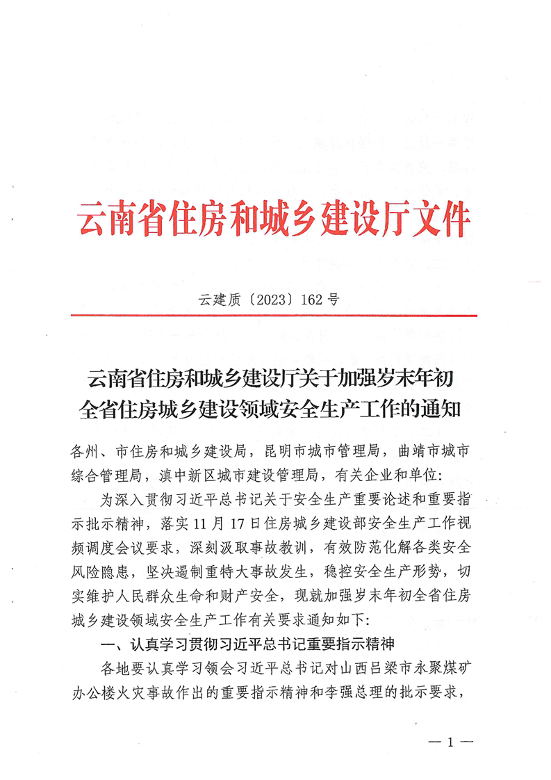 云南省住房和城鄉建設廳關于加強歲末年初全省住房城鄉建設領域安全生產工作的通知